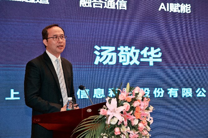 图为上海声通信息科技股份有限公司董事长汤敬华做主题发言。(主办方供图)