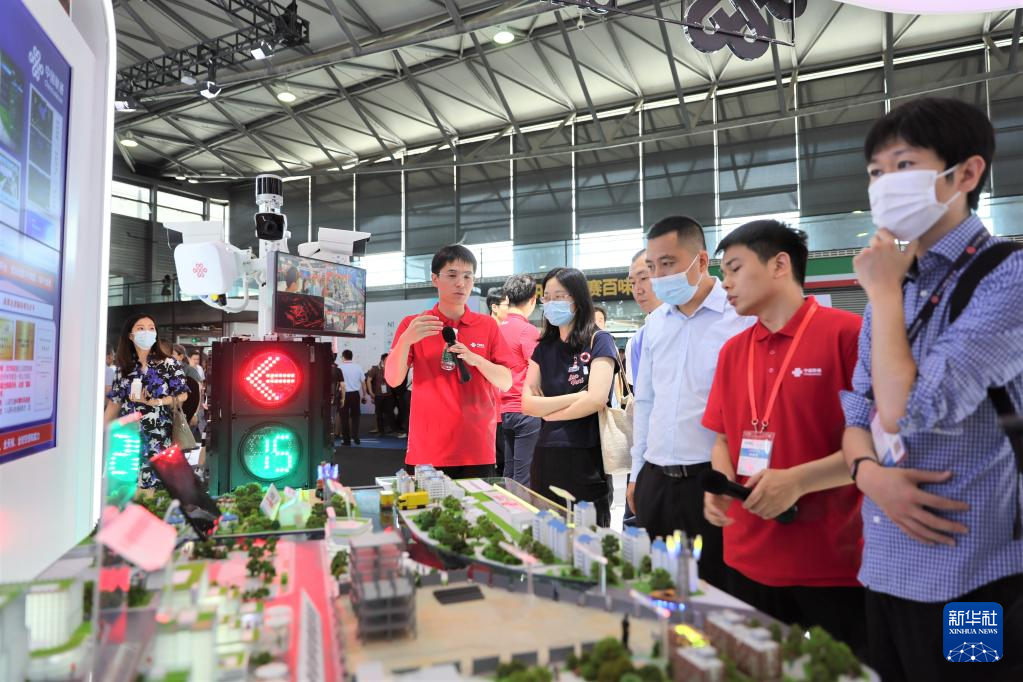 6月28日,工作人员在中国联通展台为参观者介绍5G通信感知智能系统。