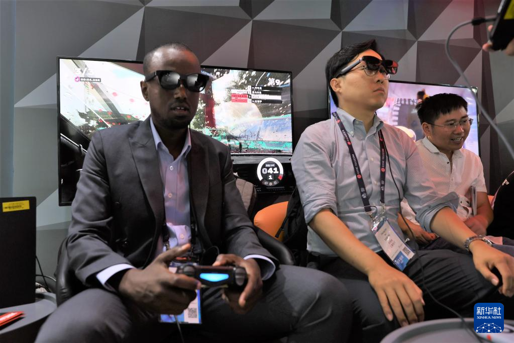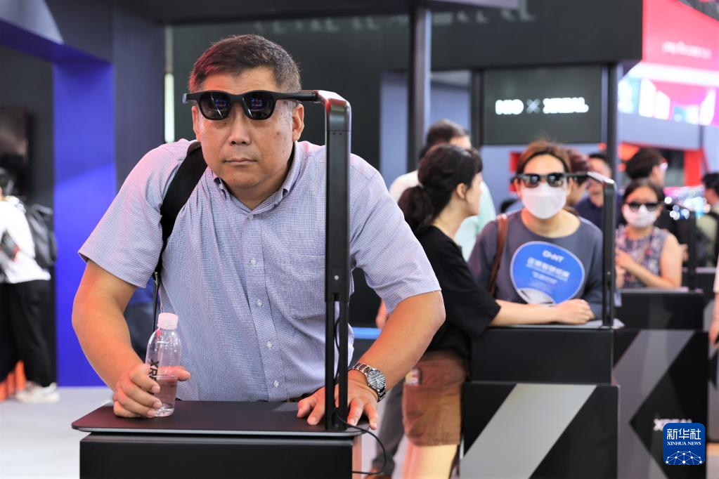 6月28日,人们在XREAL展台佩戴AR眼镜试玩游戏。
