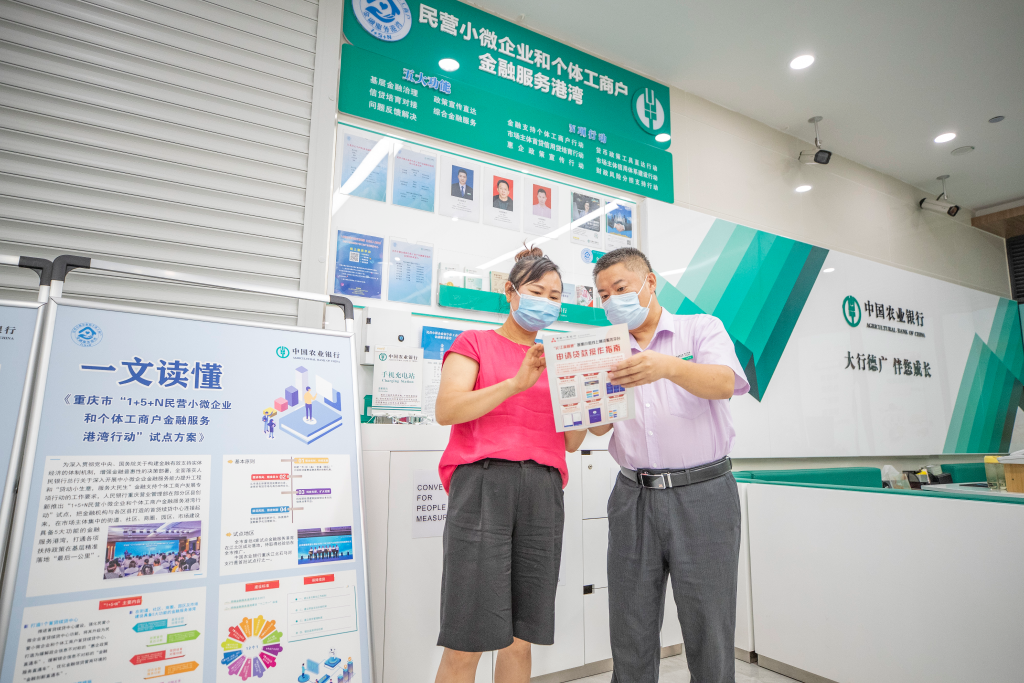 农行重庆江北石马河支行的客户经理向批发市场的商户介绍普惠金融贷款相关政策和产品。新华社记者黄伟 摄