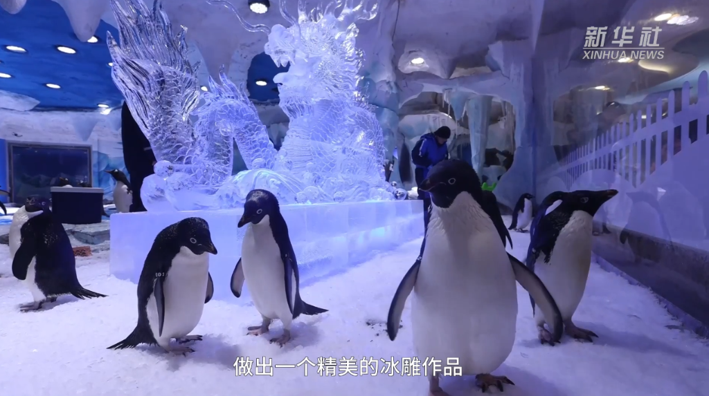 近日,上海海昌海洋公园的南极企鹅馆内迎来一座长3米、高2.8米的龙形冰雕作品。近距离观赏化水、切割、粗雕、细雕、打磨等一系列工序的演示,观众能沉浸式体验哈尔滨省级非遗冰雪雕技艺的独特魅力。