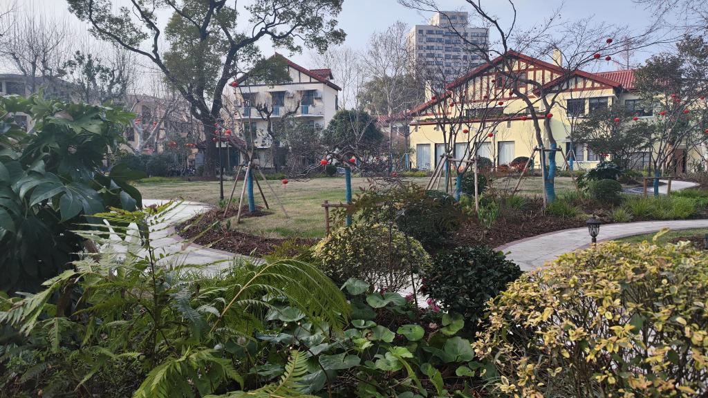 在吴兴花园,绿树枝头挂着一个个喜庆的红色小灯笼,年味十足。不时有市民游客驻足停留,有人牵着宠物狗路过,有人用手机拍下美景,也有人坐在椅子上歇脚。很难想象,一年前人们来到这里只能看到一堵围墙。