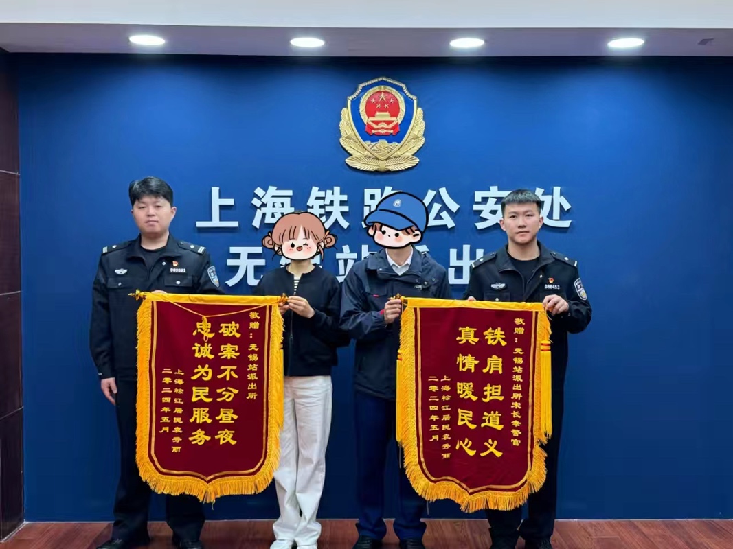 近日,上海市民奚先生夫妇将两面印有“破案不分昼夜 忠诚为民服务”“铁肩担道义 真情暖民心”字样的锦旗送到上海铁路公安处无锡站派出所民警手中。