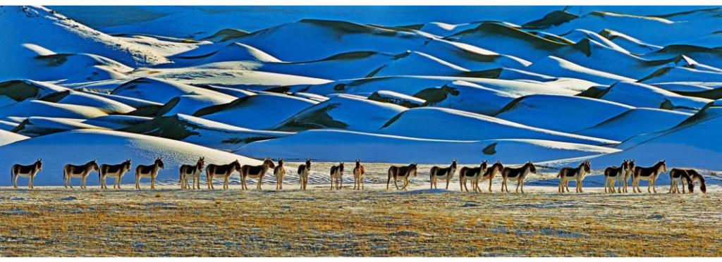 在作品展中,一幅名叫《期盼永恒的宁静》的作品尤为引人注目。画面中,24头藏野驴排着队出现,在柔和的阳光和远处的雪山映衬下,显得格外宁静而唯美。这幅作品不仅展现了藏野驴的优雅与从容,更传递出冯刚对大自然和谐共生的深深期盼。