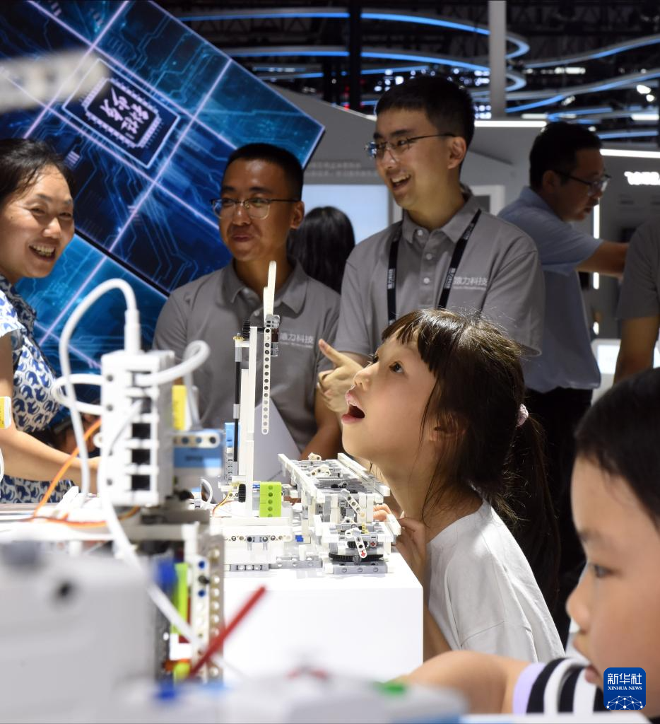 7月4日,在猿力科技展台,两名女孩在体验“编程智能硬件”。