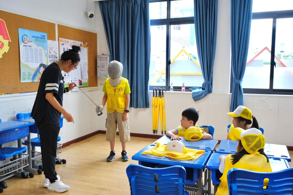 7月8日,在位于上海市敬业初级中学的老西门街道爱心暑托班,小学生们在了解体验击剑运动。