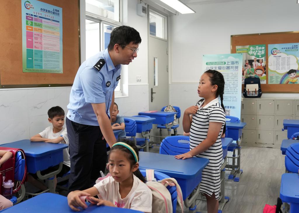7月8日,在位于虹口区第一中心小学的北外滩街道爱心暑托班,社区民警在“开班第一课”安全教育课上与小学生互动。
