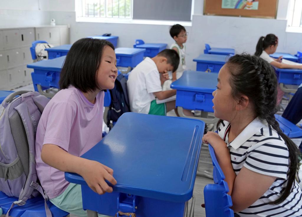 7月8日,在位于虹口区第一中心小学的北外滩街道爱心暑托班,两名小学生们在休息时聊天。