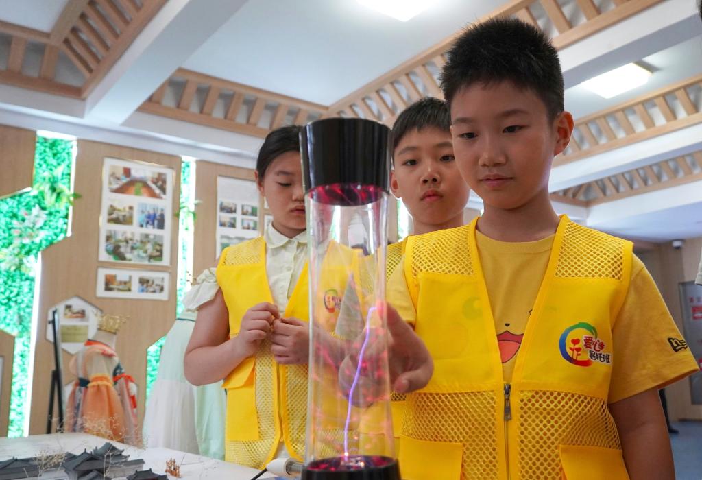 7月8日,在位于上海市敬业初级中学的老西门街道爱心暑托班,小学生们借助等离子体发生器,了解电学知识。