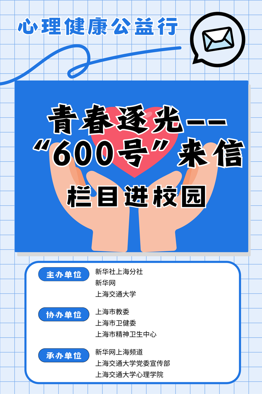 《“600号”来信》是由新华社上海分社联合上海市精神卫生中心于2023年起推出的一档全媒体栏目,其旨在邀请上海市精神卫生中心的专家,就青年群体常见的心理健康问题进行细致分析,提供应对方法,更好呵护青年群体心理健康。