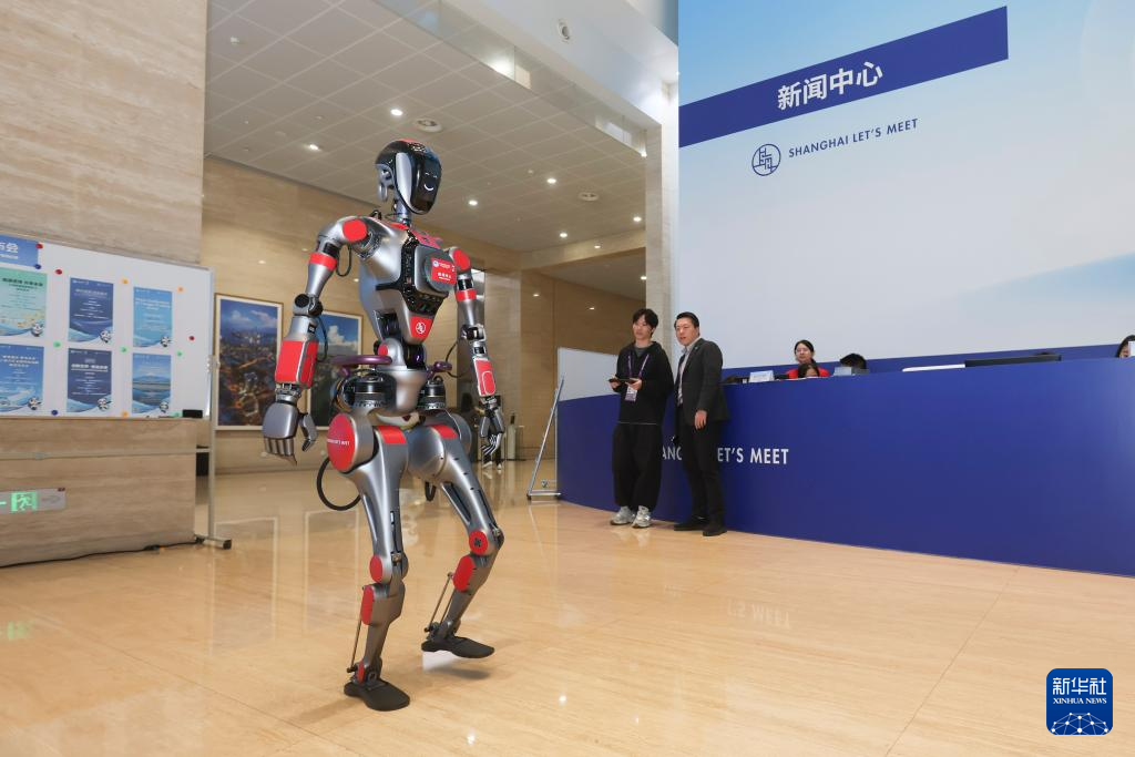 11月3日在第七届进博会新闻中心一楼拍摄的咨询服务人形机器人“小新”。