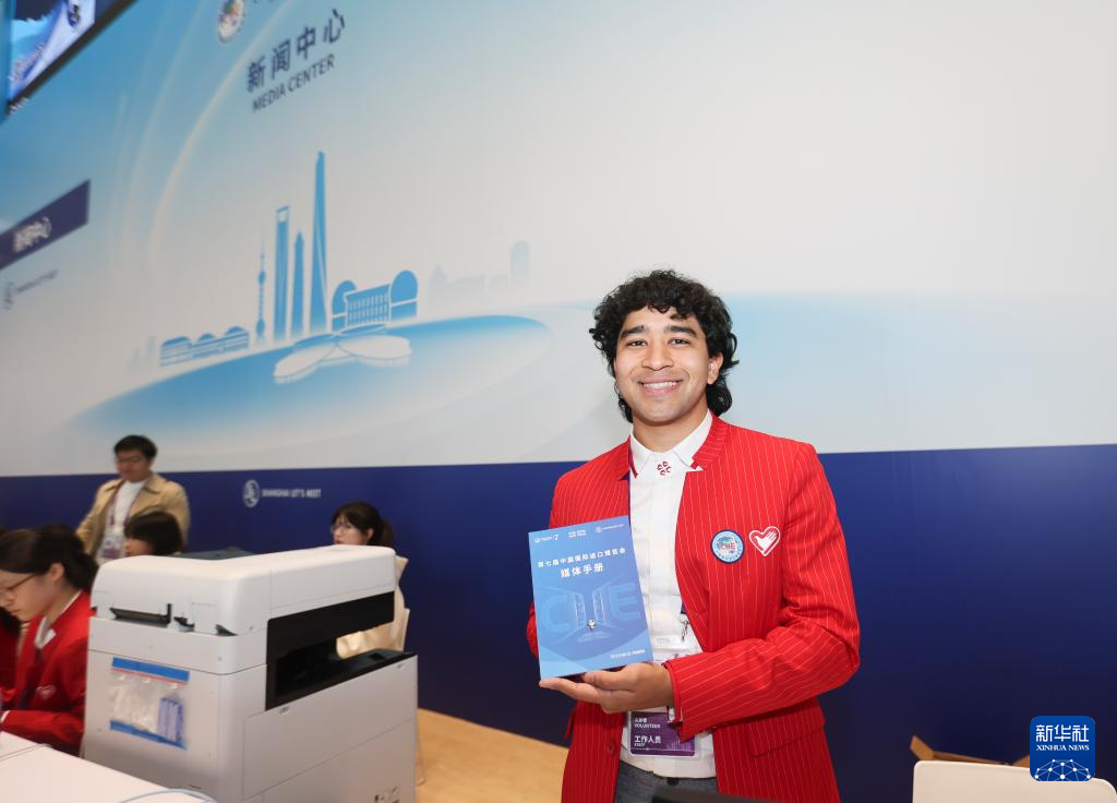 11月3日,同济大学巴拿马籍留学生阿荣在第七届进博会新闻中心综合咨询台展示媒体手册。这是他第二次担任进博会志愿者。