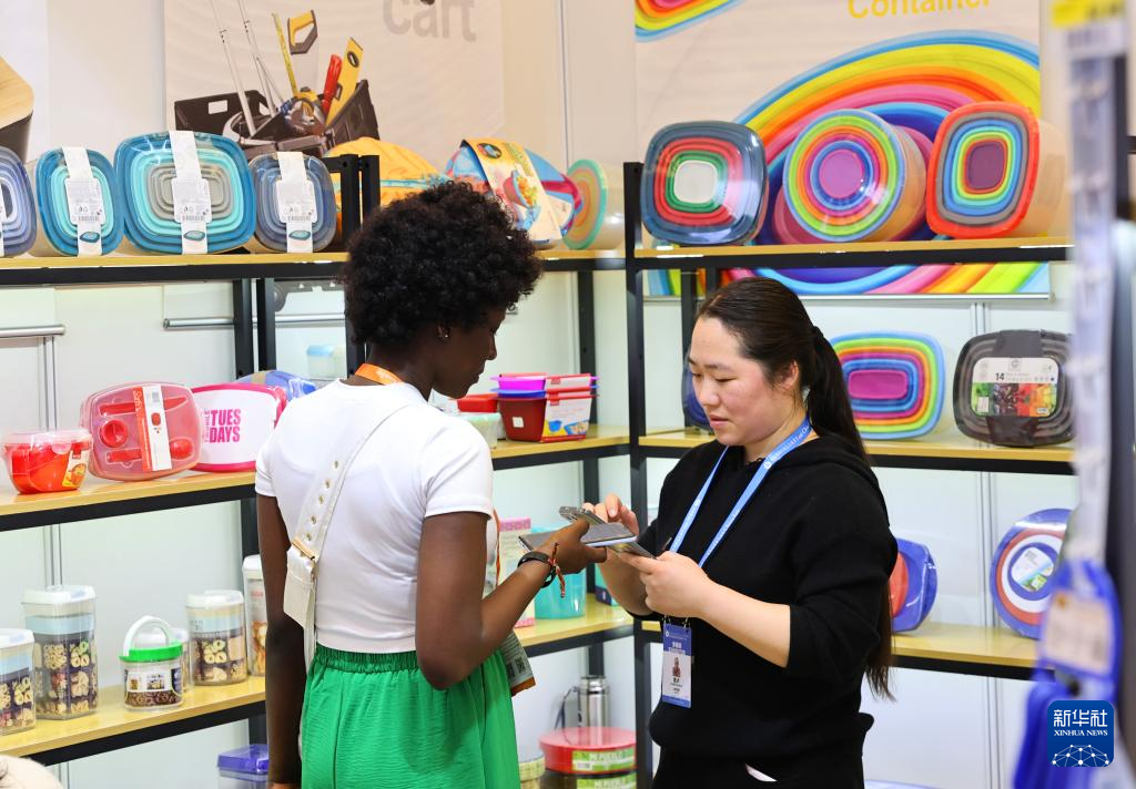 3月1日,人们在第33届华交会一处家庭用品展位交流。