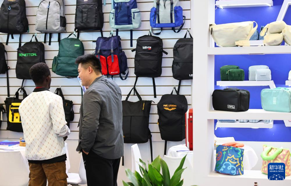 3月1日,在第33届华交会上,箱包企业展商(右)向客商介绍产品。