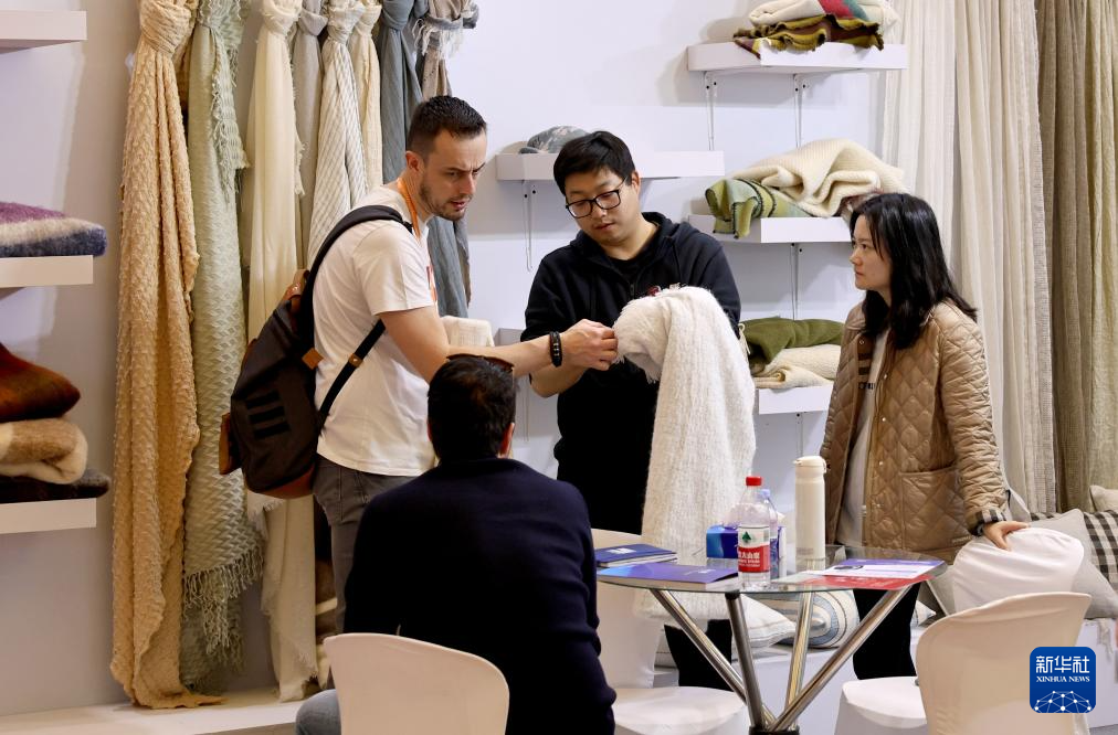 3月1日,在第33届华交会上,外国客商(左一)在一家纺织品企业展位了解展品。