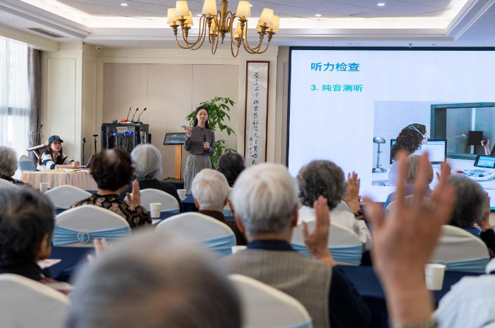 “现代听力检测技术已经非常发达了,例如电耳镜、声导抗等检查都可以在短短几秒钟内大致判断外耳、中耳疾病。”张天璠针对中老年听力健康问题,以听力维护与筛查为主题,向长者们科普听力下降的原因、危害以及合理使用助听器的重要性。