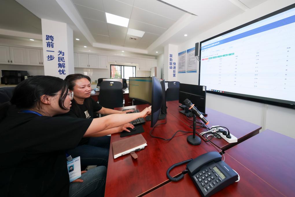 5月12日,在杨浦区殷行街道第五综合网格工作站,市光一村第二居民区党总支书记朱庆(右)和市光二村第一居委会党总支书记王连凤讨论通过“一键呼叫”与居民高效沟通。新华社记者 王翔 摄