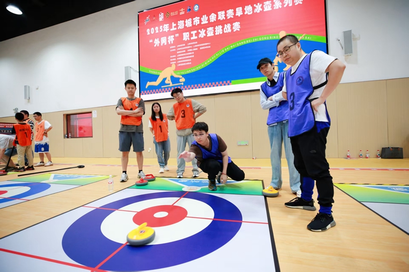 新华网上海6月15日电(许超)2025年上海城市业余联赛旱地冰壶系列赛“外冈杯”职工冰壶挑战赛于14日在上海市嘉定区举行,120余名“冰面智者”成人组和青少年组两个组别展开了默契与精准的较量。