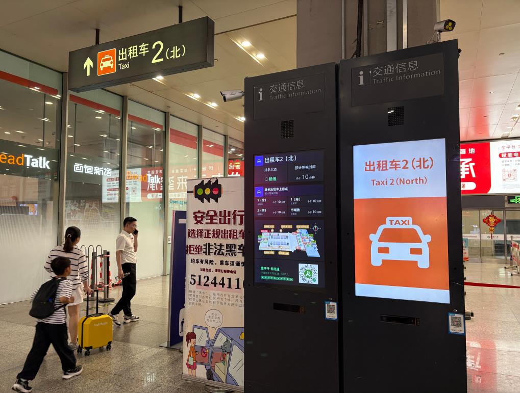 除了手机上的便捷导航,上海虹桥火车站内的4个出租车上客点及P9、P10停车场进口处的醒目位置,新安装了6块高清显示屏,屏上排队时间、站内位置一目了然,解决了旅客过往反映集中的问题。