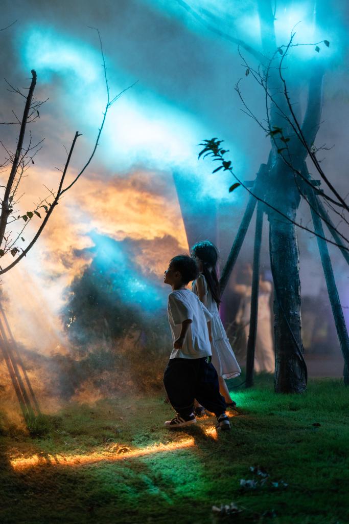 夜晚的徐汇西岸,黄浦江风轻拂。点点“流萤”在草丛间闪烁跃动,与远处西岸穹顶艺术中心的巨型投影交相辉映。这个秋天,上海正上演一场光与城的浪漫共舞。