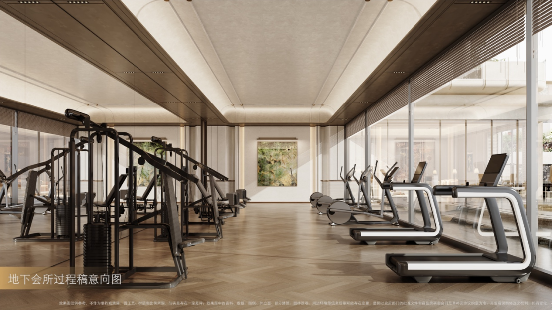 进入社区,便是约3000㎡鎏金会所,一半是地下会所,一半是架空层泛会所。约1500㎡的地下会所中,还打造了恒温泳池、健身房、瑜伽室、私宴区等八大功能区,下楼即享。