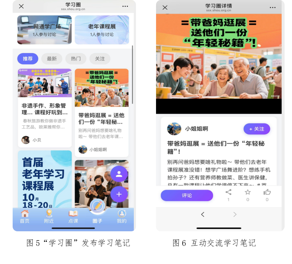 “学习圈”交流互动功能主推社群知识分享与传播。在学习圈,学习者可以发布丰富多样的学习内容,分享学习笔记、选课攻略,撰写真实的课程体验;同时也可展示学习团队的精彩成果,包括合唱团的演出视频、书画作品的创作过程、手工制作的技艺分享等。在学习圈,每个学习者既是知识的接收者,也是知识的创造者和传播者。“学习圈”功能不仅为终身学习注入了更多活力和创新元素,也展现了数字化时代终身教育模式变革的新方向。