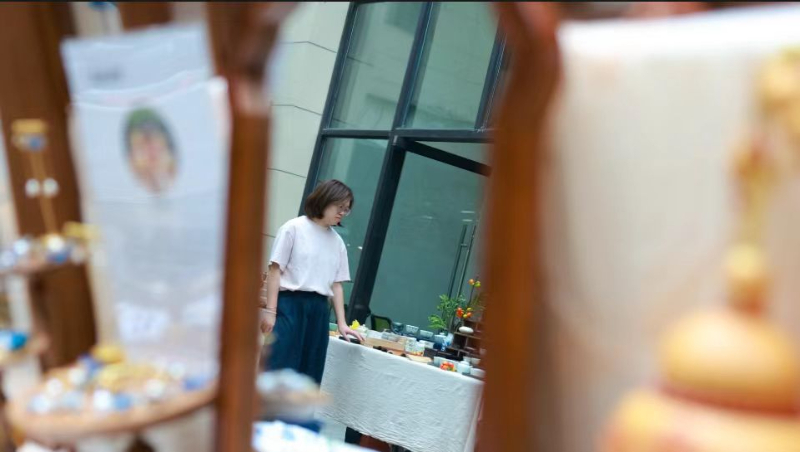 除了特色艺术展览,各类文创展位前同样人头攒动,首饰、茶具、丝巾等产品颇具设计感,传统与现代元素在此交织碰撞。其中,一个由志愿者负责的展位尤为吸睛,这里陈列的发卡、麦秆画、钩针包等手工艺品,全部由志愿者们利用业余时间亲手制作。该展位的全部收入,将直接捐赠给“5458小红花”公益项目。