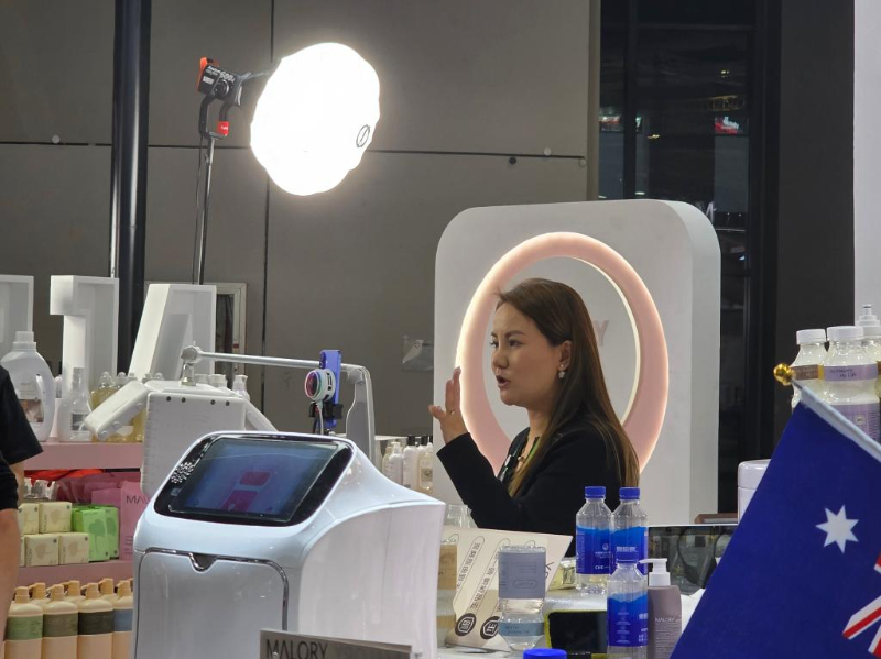 金灵勇说:“抖音、微信视频号、快手等平台,甚至是私域流量里的直播间,我们几乎把品牌旗下所有的直播间都带到了进博会。我们今年还与40多个达人主播合作,他们将在不同时段来到我们的展位为品牌带货。”