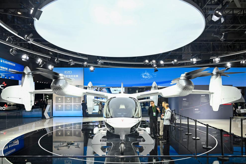 11月6日,在第八届进博会汽车及智慧出行展区的科技展台,展商(中)在向观众介绍E20 eVTOL电动垂直起降飞行器。新华社记者 陈浩明 摄