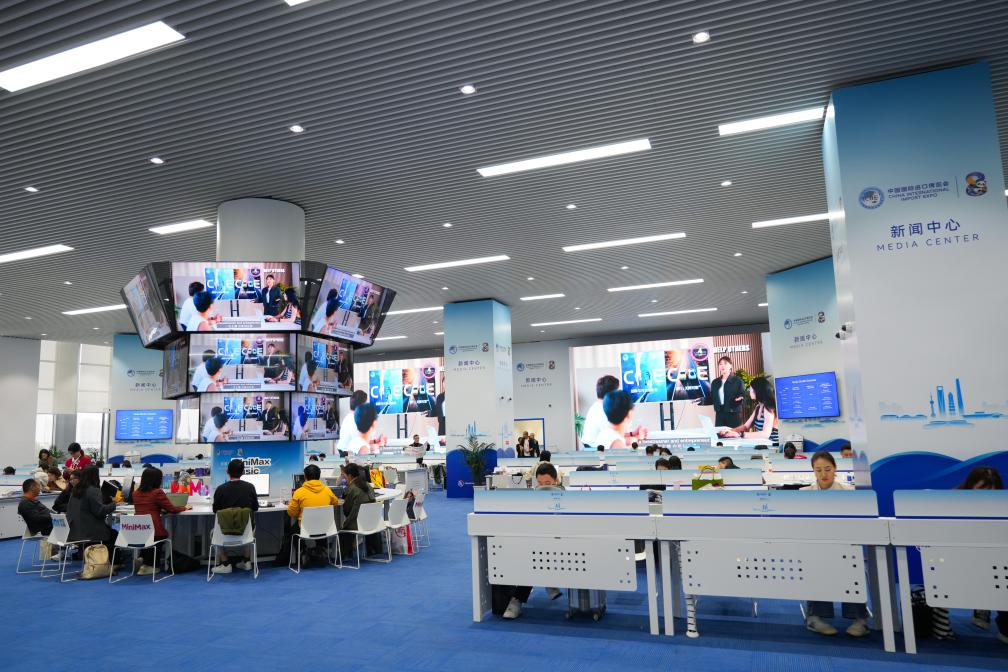 11月8日,媒体记者在新闻中心进行报道。