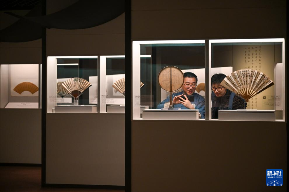 11月13日,媒体人员在“至扇至美:上海博物馆藏历代扇面书画名品展”展品前驻足观看。