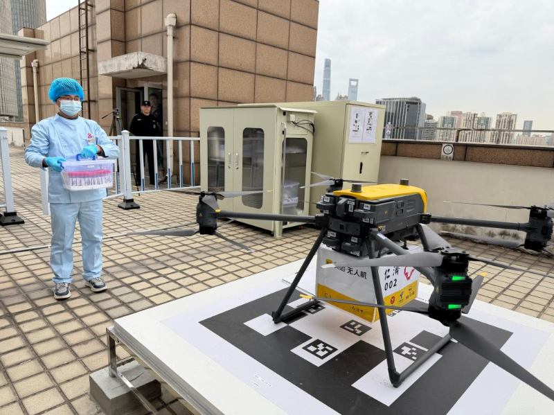 12月10日,一架无人机运载着医疗检验样本,从上海交通大学医学院附属仁济医院东院起飞,飞往14.5公里外的南院。同时,随着另一架无人机自仁济医院北院起飞,8分钟后平稳降落在4公里外的东院9号楼楼顶,上海市内首批常态化无人机医疗样本配送航线正式开通。