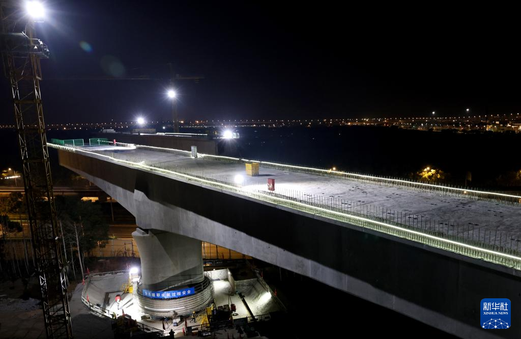 1月8日,一列磁悬浮列车(右下)从川沙特大桥跨磁悬浮连续梁转体施工现场驶过。