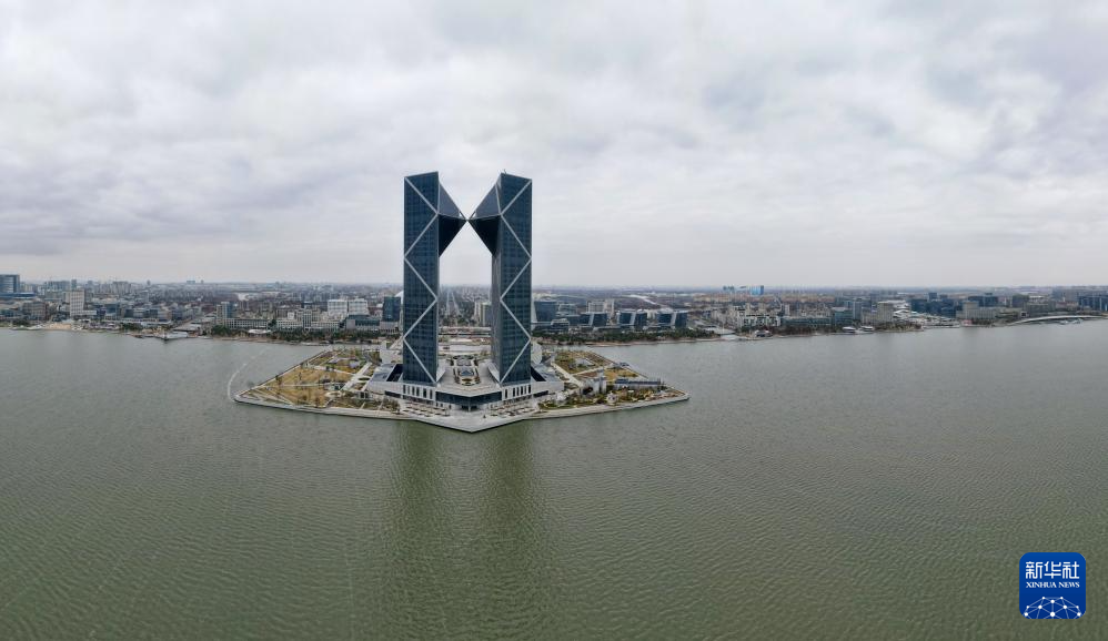 1月29日拍摄的位于滴水湖畔的临港西岛中银金融中心双子塔楼(无人机全景照片)。