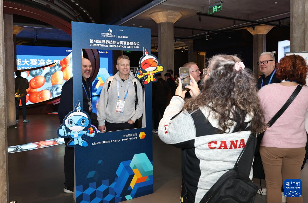 2月4日,嘉宾在第48届世界技能大赛准备周会议展板前合影留念。