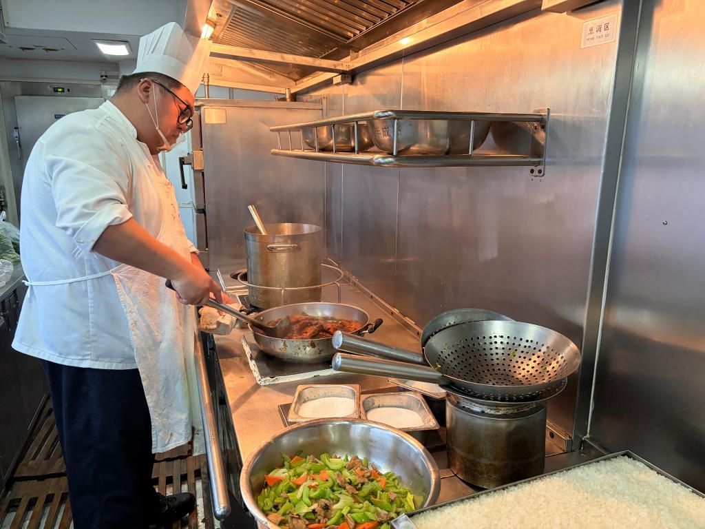 李睿晟也稍稍有了休息时间。从乘务员转行厨师已经10年了,他热爱烹饪,做这份工作很有获得感,“餐车虽然有供应时间,偶尔半夜有乘客饿了,我们在岗就会端上一碗热面,乘客满意,我们更高兴”。