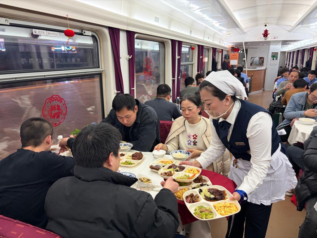 “饭来咯,大家当心。”随着餐车服务员的吆喝,锅气十足的饭菜被端上餐车的餐桌,乘客们大快朵颐,还有人到吧台买上啤酒饮料。“一口酒、一口菜,酒足饭饱后,再到卧铺美美睡上一觉,就能到达目的地,我觉得坐绿皮车很舒服。”乘客杨琼说。