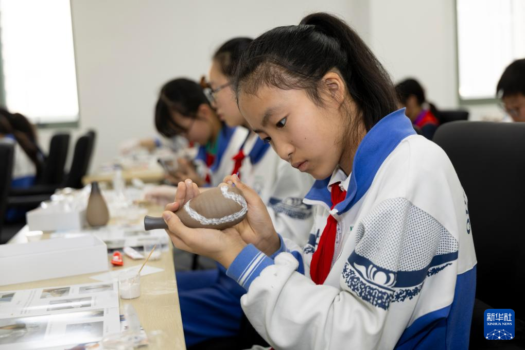 4月10日,学生参加艺术工作坊体验破损陶瓶的修复。