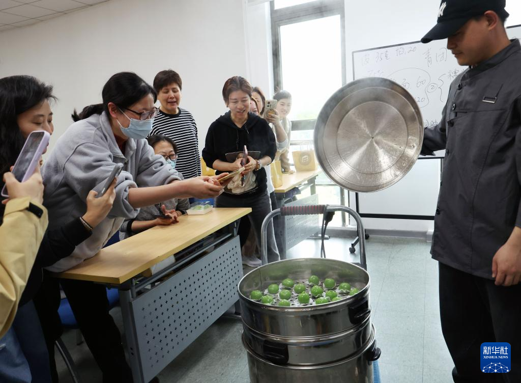 4月13日,在上海市群众艺术馆,“中式点心”课的老师为学员们示范青团的包制方法。