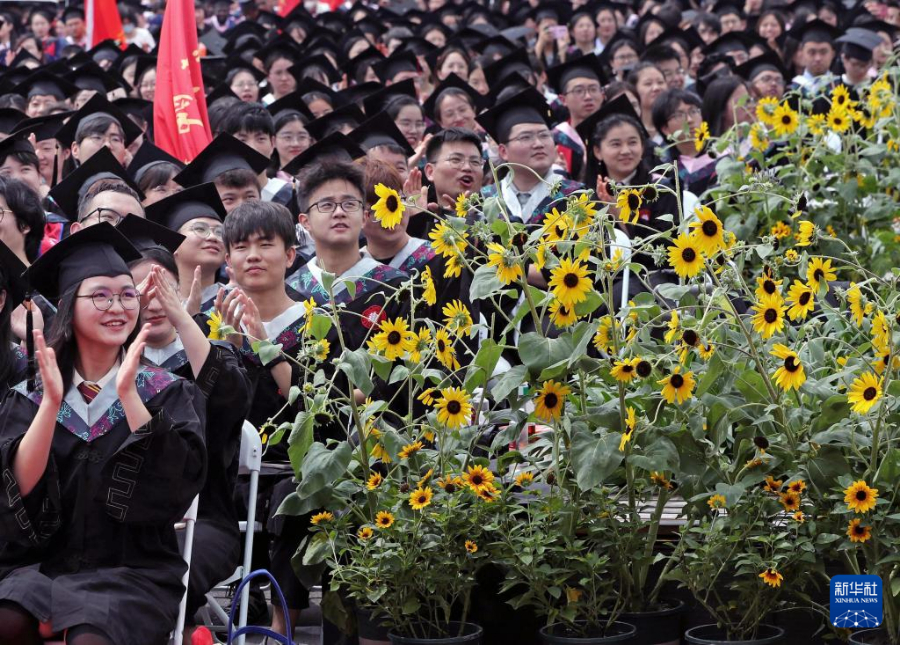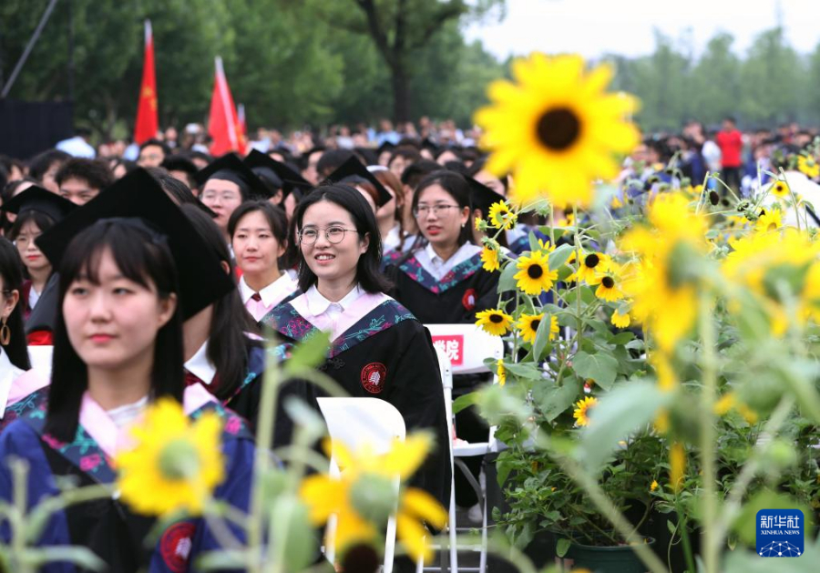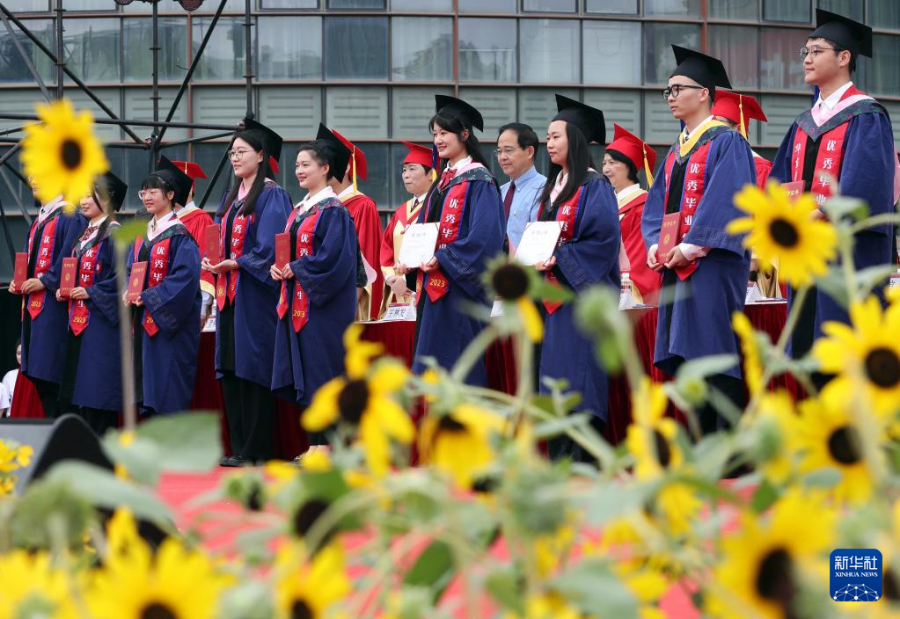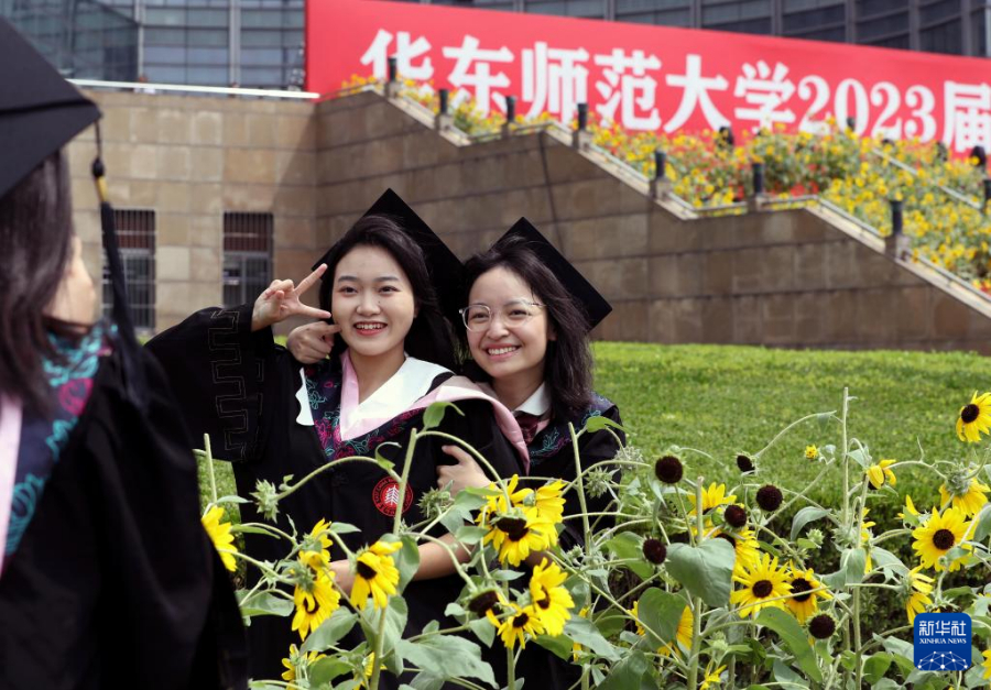 6月20日,在华东师范大学2023届毕业典礼前,毕业生们在向日葵前合影。向日葵是由毕业生票选、学校专门种植的“毕业花”。