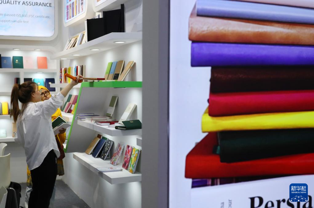 7月12日,一名来自巴基斯坦的展商(右)在展位与参观者交流。