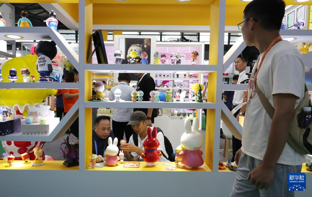 7月12日,参观者在一个玩具企业展台内交流讨论。