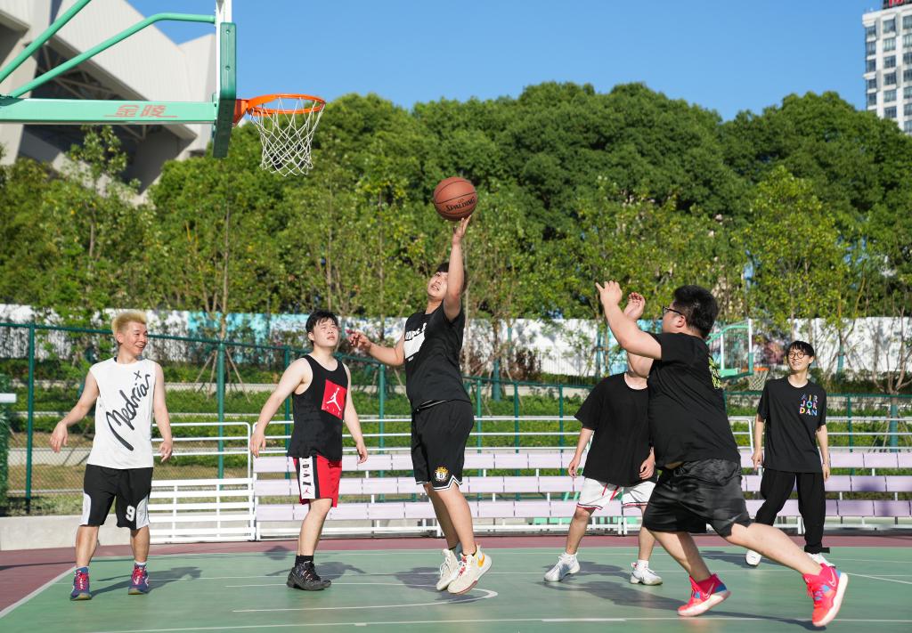 市民在上海市徐家汇体育公园内打篮球。新华社记者丁汀摄