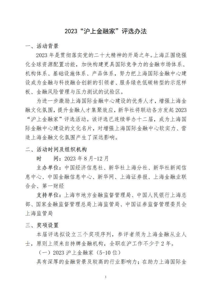 “沪上金融家”评选由中国经济信息社、新华社上海分社、新华社新闻信息中心、中国金融信息中心、新华网、上海证券报、上海金融业联合会、第一财经主办,上海市地方金融监督管理局、中国人民银行上海总部、国家金融监督管理总局上海监管局、中国证券监督管理委员会上海监管局为支持单位。