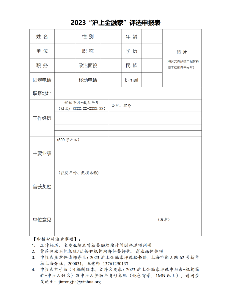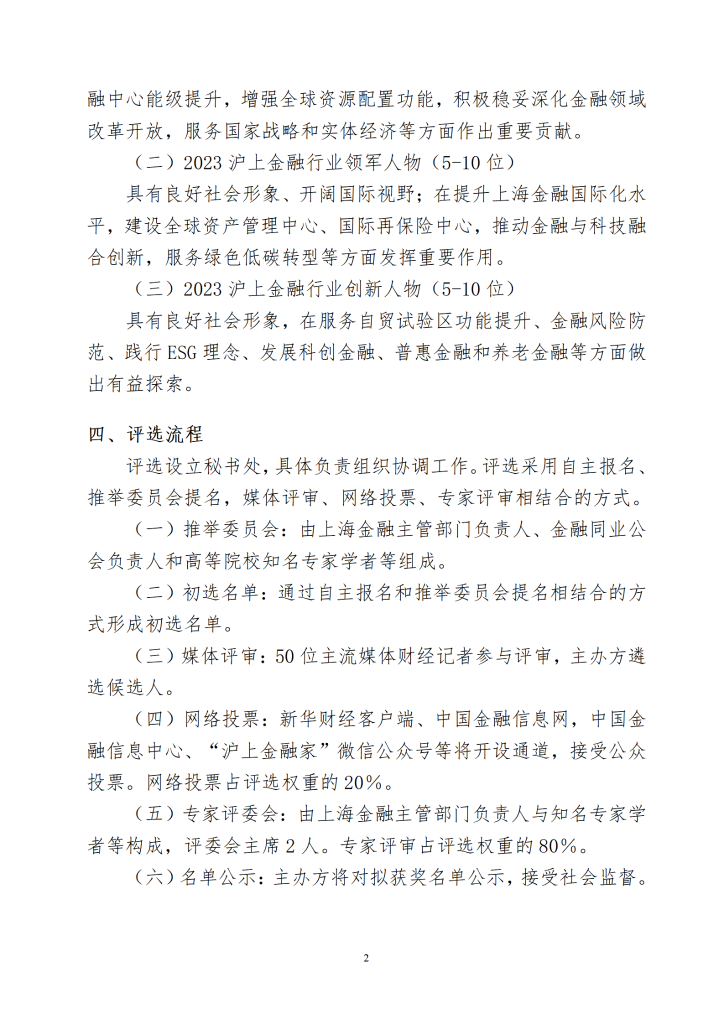 据介绍,本届评选设立“2023沪上金融家”“2023沪上金融行业领军人物”“2023沪上金融行业创新人物”三个奖项序列,尤其鼓励在金融与科技融合创新、服务绿色低碳转型、金融风险管控等方面有所建树的英才参选。参评者原则上须来自持牌金融机构,全职在上海工作不少于2年。