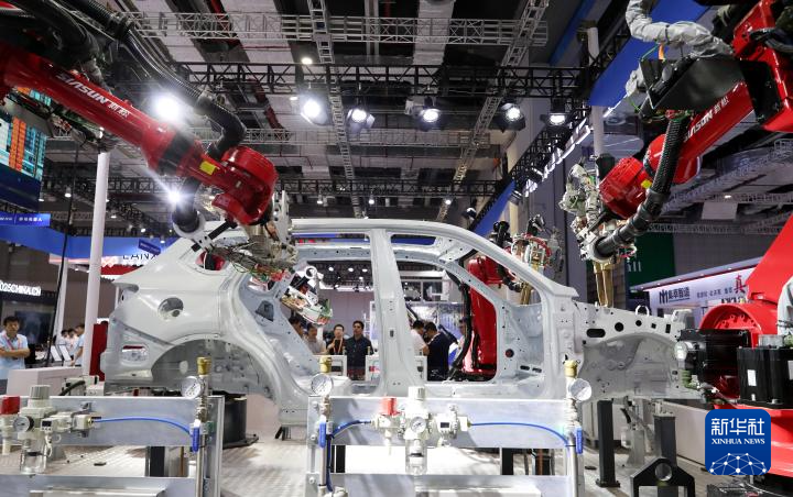第二十三届中国国际工业博览会在上海开幕。参观者在一组进行车身焊接演示的机器人前驻足观看。新华社记者 方喆 摄