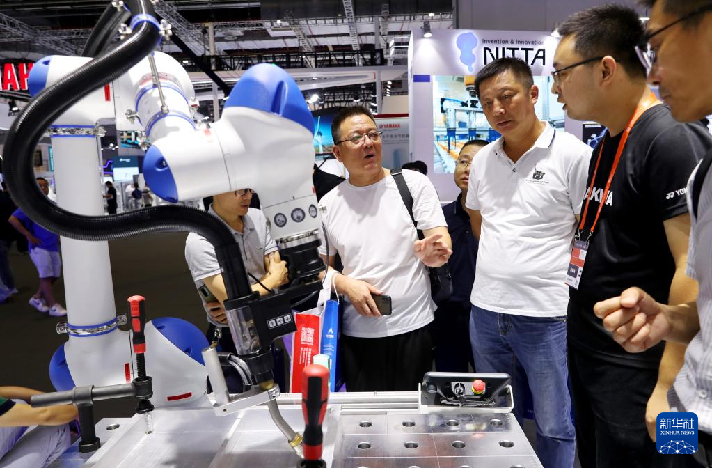 第二十三届中国国际工业博览会在上海开幕。参观者与工作人员在一个人机协作电池盒焊接系统旁交流讨论。新华社记者 方喆 摄