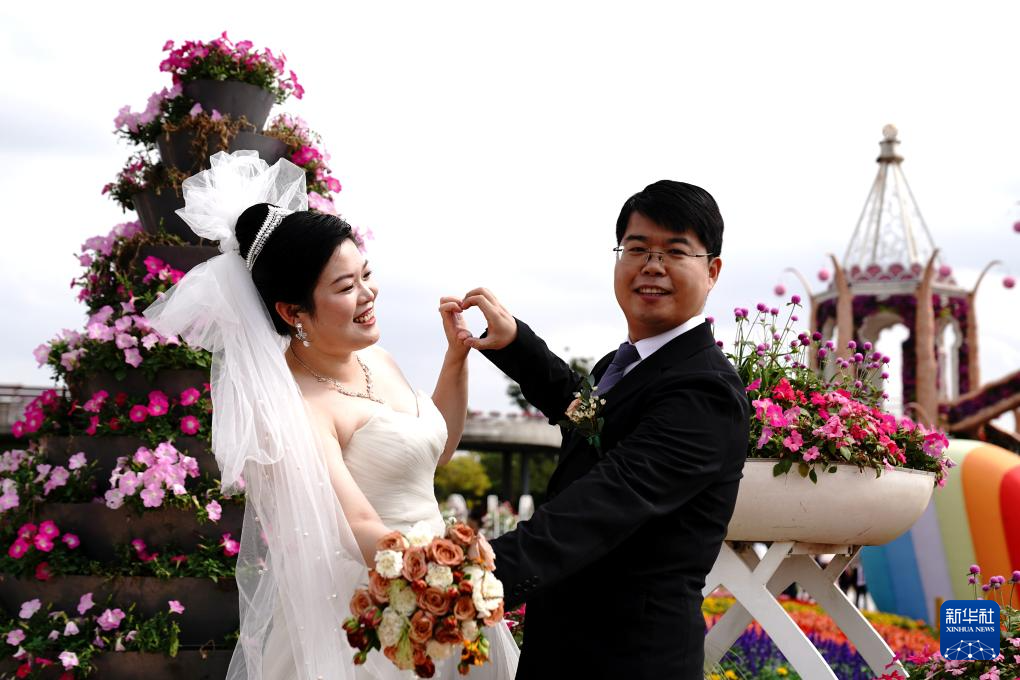 10月12日,一对航天新人在上海浦江郊野公园举行的集体婚礼上拍照。