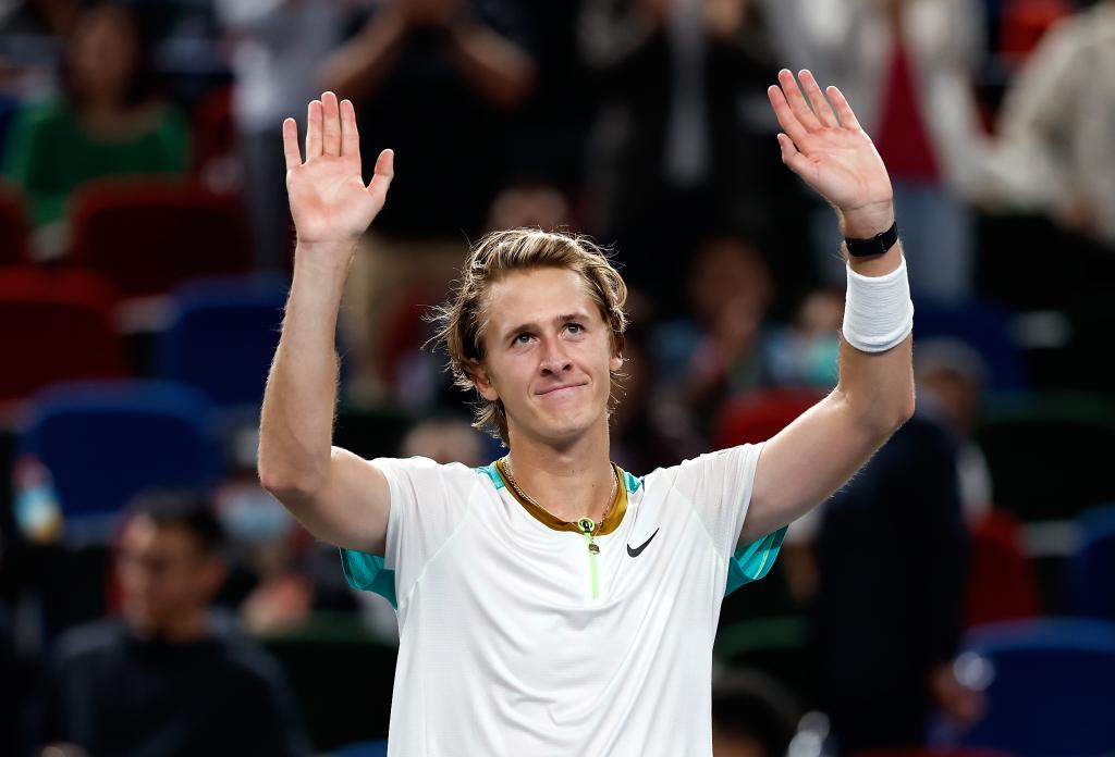 10月12日,科达在比赛获胜后向观众致意。当日,在2023年ATP上海网球大师赛单打四分之一决赛中,美国选手科达以2:1战胜另一位美国选手谢尔顿,晋级四强。新华社记者 王丽莉 摄