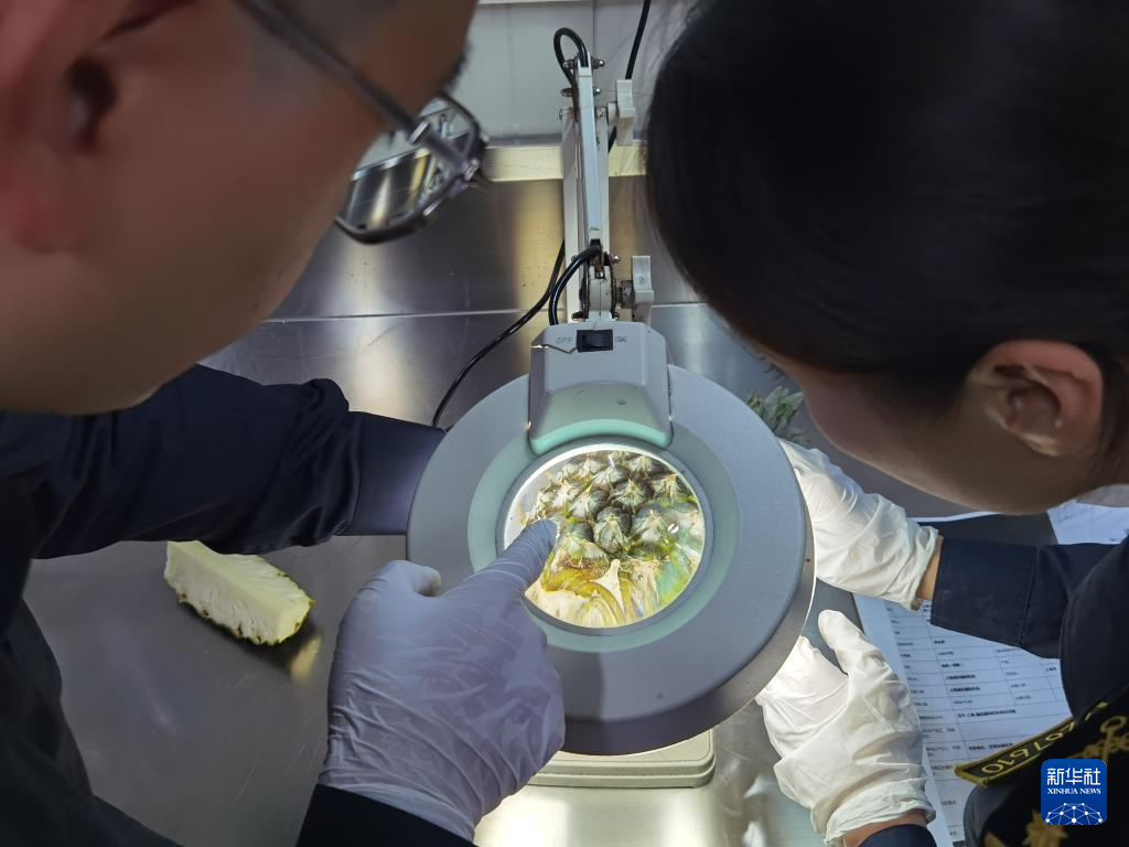 11月3日,上海海关关员对首批入境中国、参展第六届进博会的贝宁菠萝进行检验检疫。新华社记者 吴宇 摄